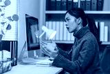 Office worker in a modern setting, expressing frustration while analyzing data on a computer screen. Shelves with binders and a desk lamp create a professional atmosphere