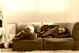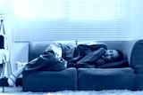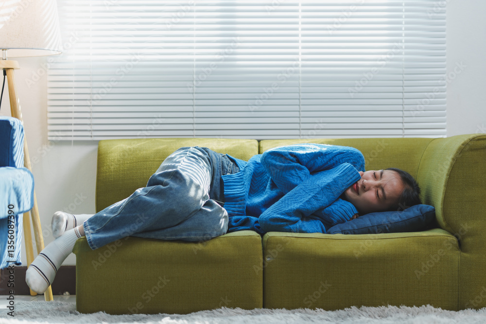 Young woman in a blue sweater and jeans sleeping on a green sofa. The room is bright, with light filtering through blinds, creating a serene and cozy atmosphere