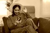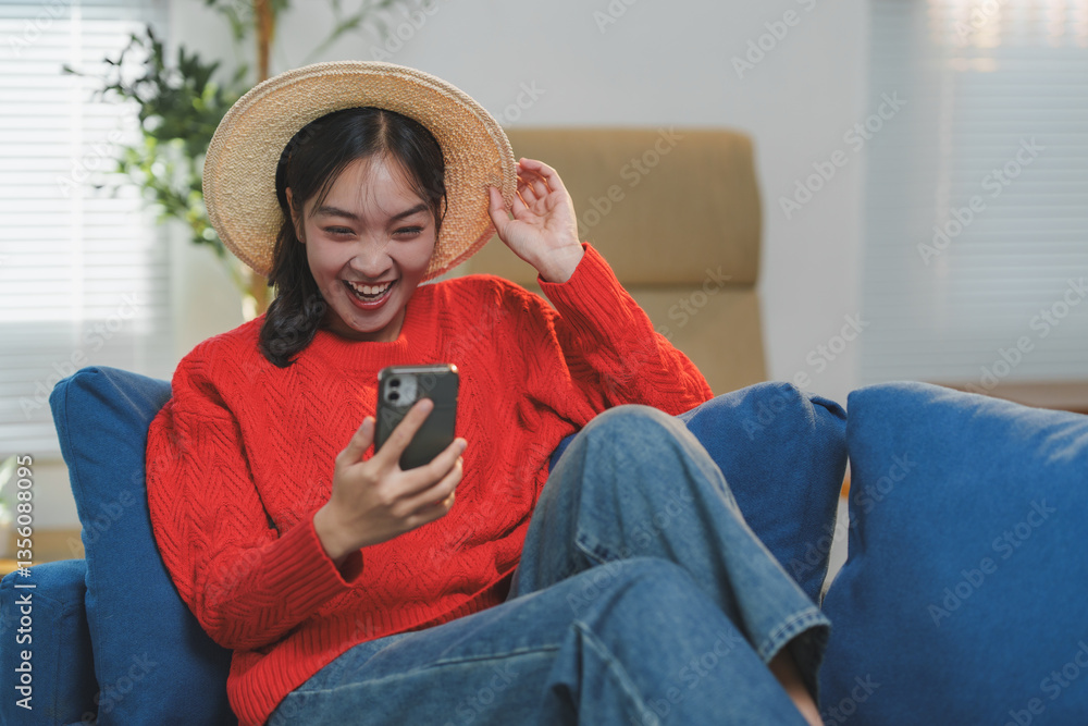 Smiling young woman in a cozy setting, wearing a straw hat and red sweater, enjoying a video call on her smartphone. Relaxed and cheerful atmosphere with natural light