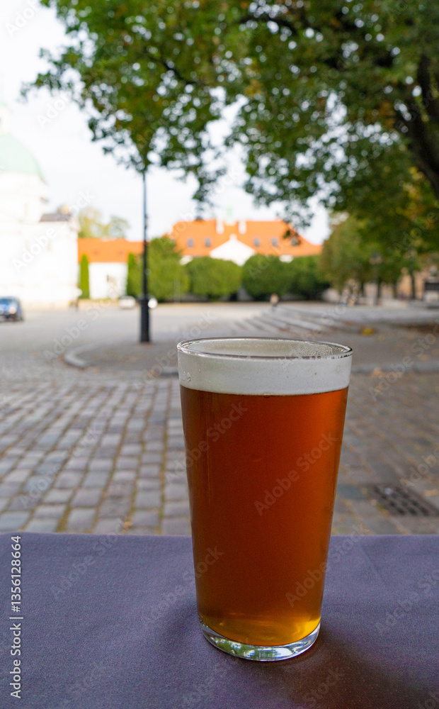 Beer glass, dark cold drink on a old European city blurred background, outdoor tourist cafe, red beer