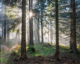 Natural Forest of Spruce Trees with Sunbeams through Fog, Bavarian Forest, Germany