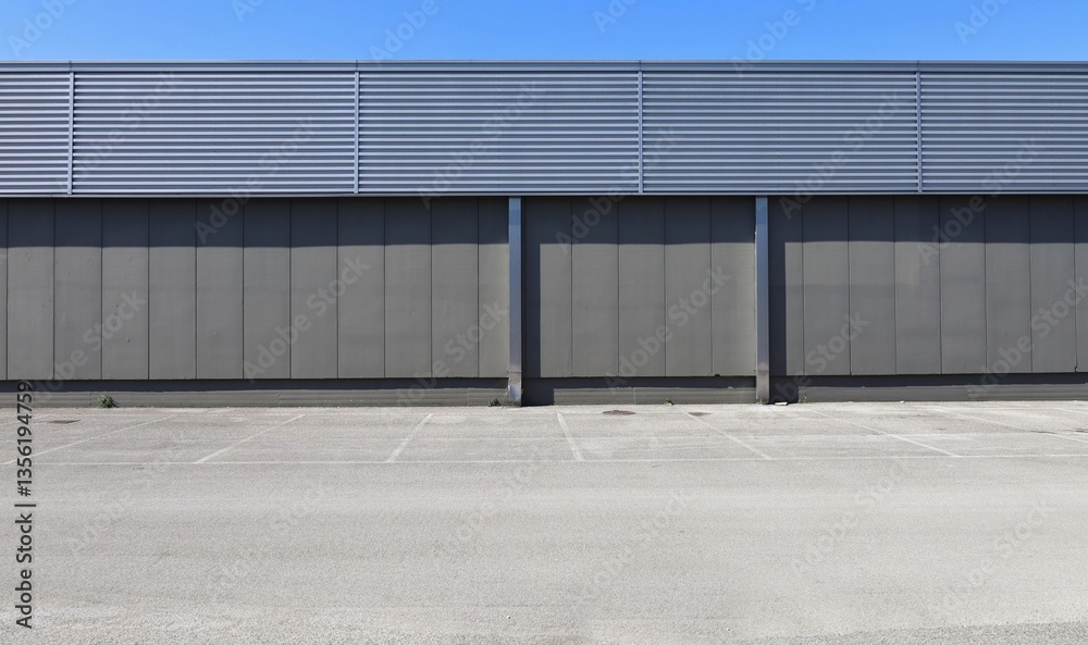 Facade made of gray concrete blocks with metal gutters in the middle and aluminium panels in the upper side. Parking lot and street in front. Background for copy space.