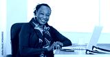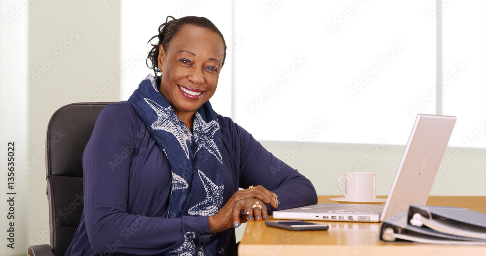 A black businesswoman poses for a portrait at her desk