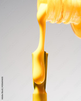 Yellow nail polish is poured onto the brush, a beautiful drop flows down