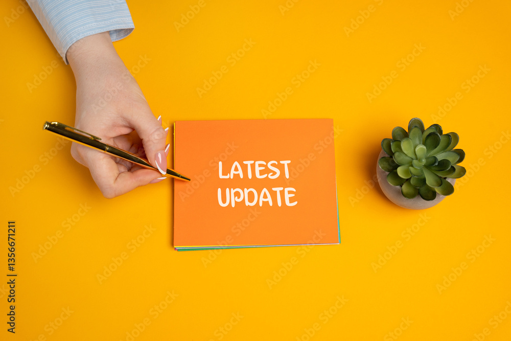 Notes with inscription Latest Update. Updating the version of software components program. New data and information. A woman writes a note in a notebook