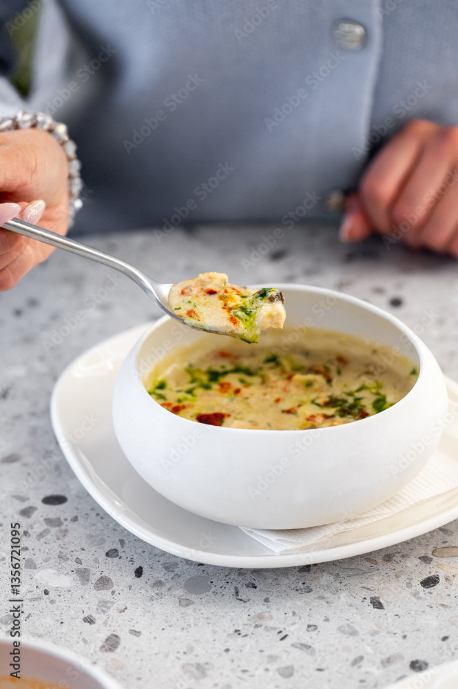 Close-up of a spoonful of creamy vegetable soup, garnished with herbs, served in a white bowl on a white plate, on a speckled countertop. Warm and comforting homemade meal.