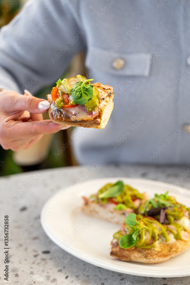 A hand holding a slice of gourmet pizza with fresh vegetable toppings, including cherry tomatoes and leafy greens, above a plate with more slices, captured in close-up.