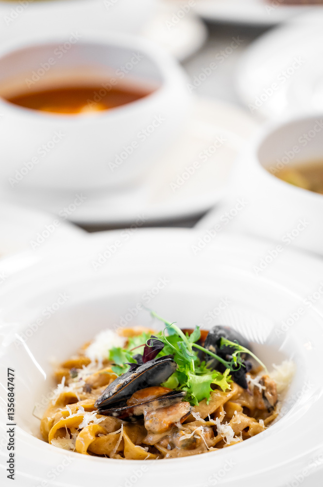 A close-up of a gourmet pasta dish with mussels, garnished with fresh greens and grated cheese, served in a white bowl. Elegant, appetizing, and perfect for seafood lovers.