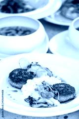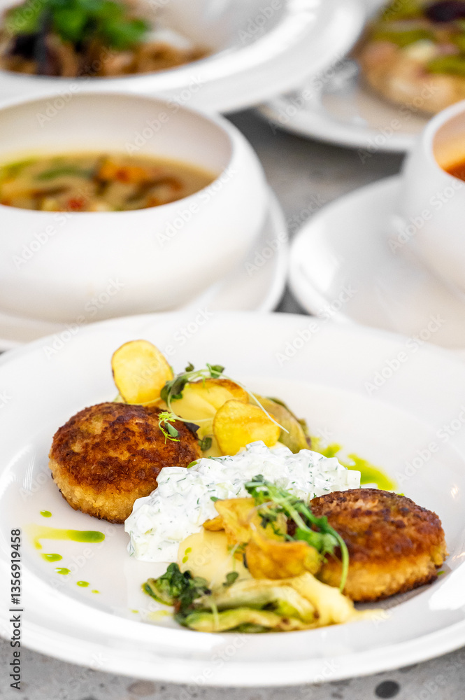 Golden-brown croquettes served with creamy herb sauce, garnished with microgreens and thinly sliced potatoes on a white plate, presented as part of a gourmet meal.