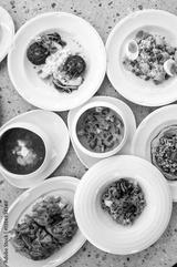 Top view of assorted gourmet dishes including soups, salads, and entrees, artistically arranged on a speckled surface, showcasing vibrant textures, colors, and fresh ingredients.
