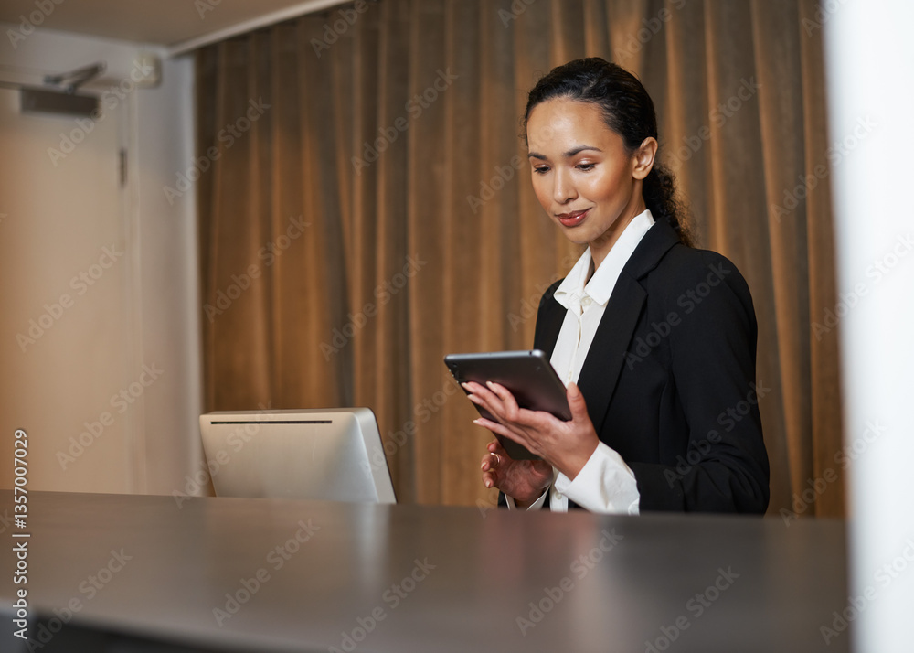Professional Businesswoman Using Digital Tablet at Front Desk in Office Setting