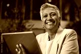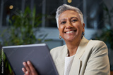 Confident Professional Woman Smiling While Working With a Tablet in a Modern Office Setting