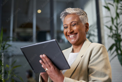 Smiling Businesswoman Using a Tablet in a Bright Office Environment
