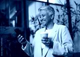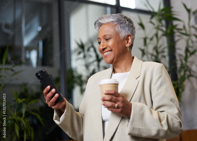 Confident Smiling Professional Woman Checking Phone While Holding Coffee in Modern Office Space
