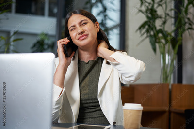 Professional Woman Experiencing Neck Discomfort While Working in a Modern Office Setting