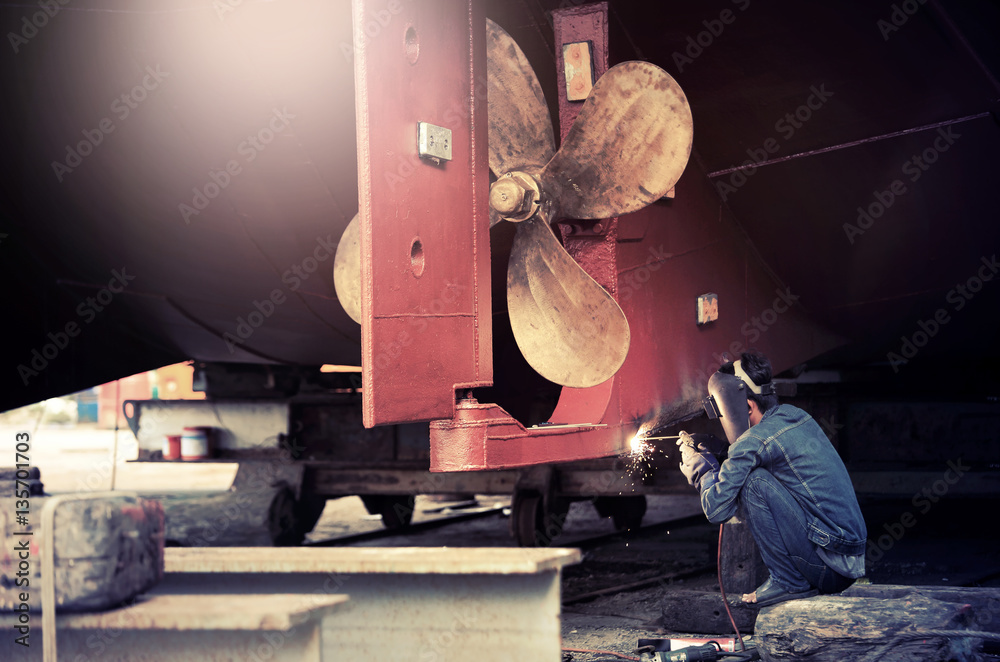 Welder man working in ship yard,color toned.