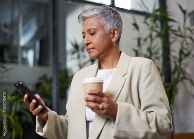 Businesswoman Using Smartphone and Holding Coffee in Modern Workspace