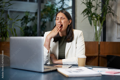 Professional Woman Feeling Tired at Work, Sitting by Her Laptop in a Modern Office