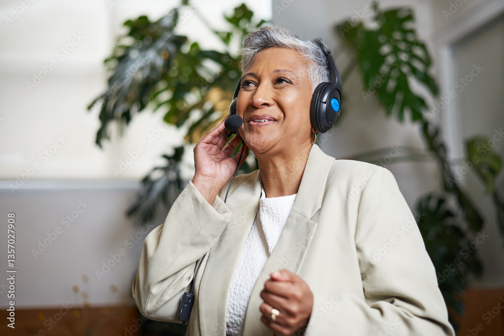 Professional Woman in Headset Engaged in Call Expressing Confidence and Positive Demeanor