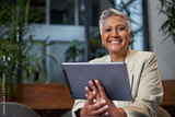 Confident Senior Woman Smiling While Using a Digital Tablet in a Modern Workplace Setup