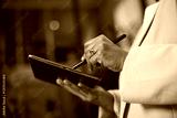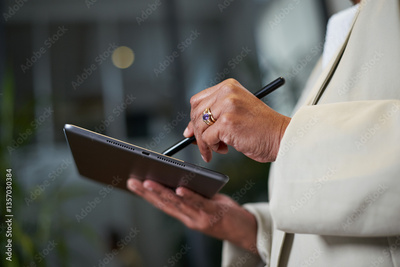 Close-Up of a Hand Using a Stylus on a Tablet in a Modern Office