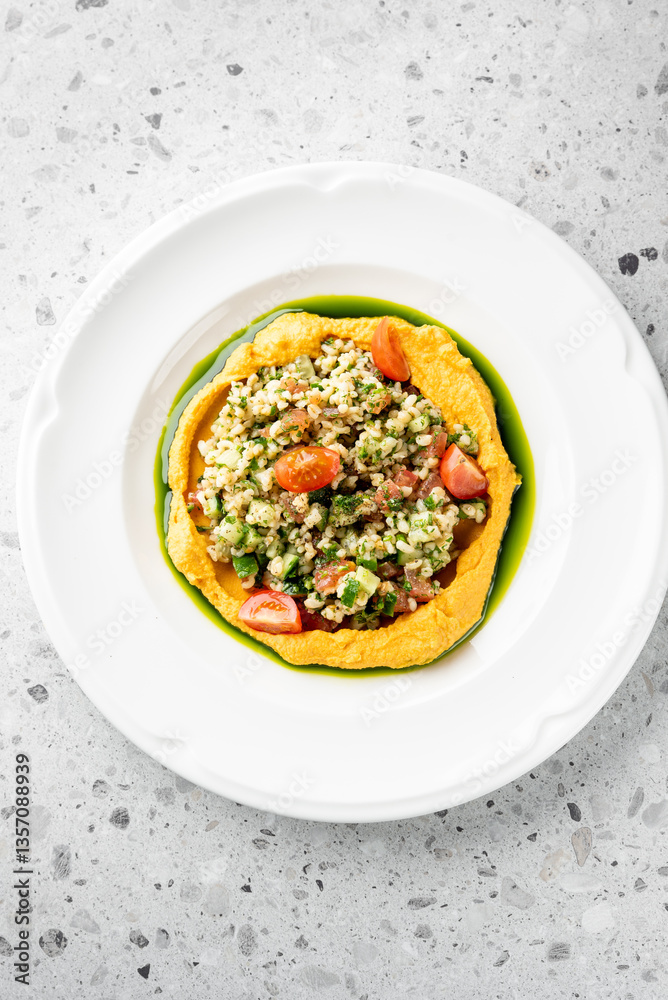 A vibrant plate featuring a fluffy, golden omelette topped with a colorful mix of diced vegetables, including tomatoes and fresh herbs, served on a green sauce.