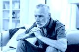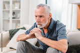 Sad tired ill sick lonely disappointed caucasian old elderly senior man grandfather sitting on the sofa couch, feeling nostalgy, pain, missing grandchildren, bankruptcy, fraud at home