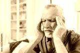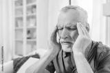 Headache. Senior man suffering from migraine pain massaging temples sitting at home. Healthcare health problems in older age stress and people medicine concept