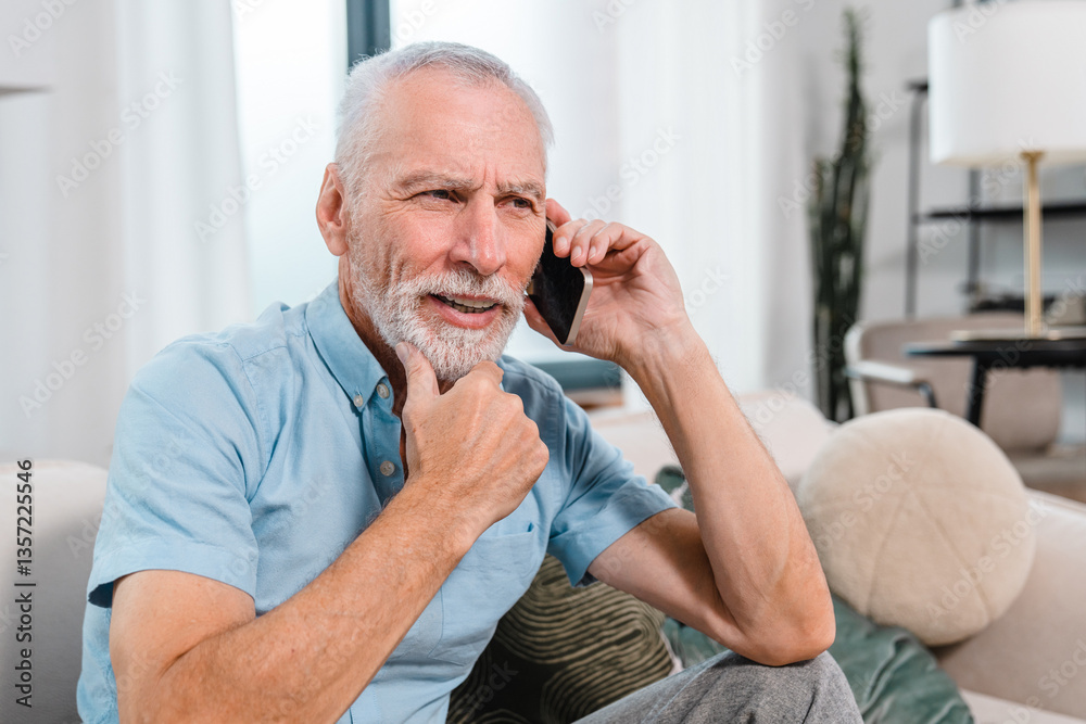 Delighted senior man chatting on a mobile phone while relaxing on sofa in living room natural close up portrait. Senior man after retirement using smart phone to connect with friends and family.