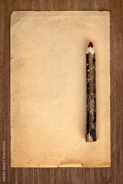 Old sheet of paper with eco pencil (made of branch) on wooden table.