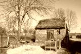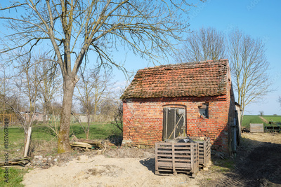 Old abandoned red brick building in the countryside.