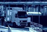 A yellow truck is parked at a construction site where workers are busy handling materials. The sun shines on the bustling activity, creating a productive atmosphere