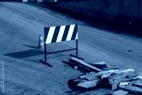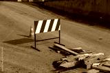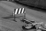 A construction area features a red and white warning barrier, a traffic cone, and wooden planks littering the road in broad daylight
