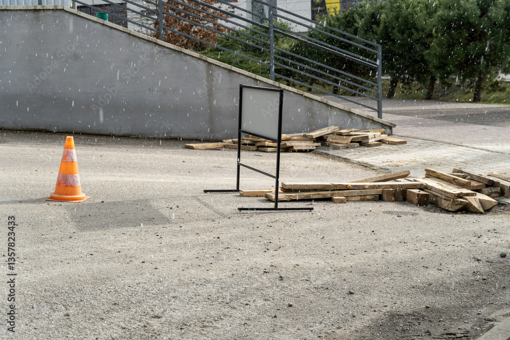 Construction materials are scattered on the ground while a caution sign stands nearby on a snowy day, indicating work in progress in an urban environment