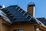 Renewable energy technology on display with sleek solar panels arranged on a contemporary home's roof under clear blue skies, promoting eco-friendly living choices