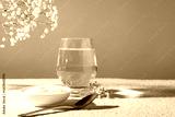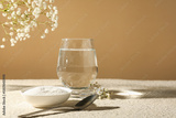 Collagen powder in bowl, spoon, glass of water and gypsophila branches on light textured table against beige background, closeup