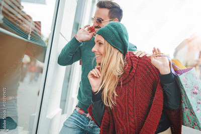 Handsome young couple in shopping. Consumerism, lifestyle concep