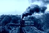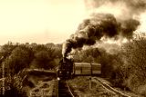 Powerful locomotive with a passenger train rushes to the railway station. Autumn sunny day