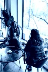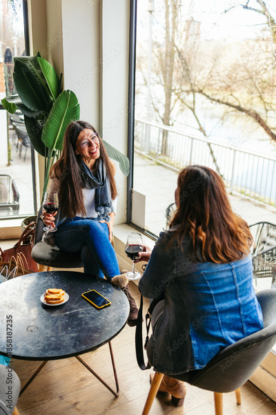 Two mature female friends are catching up and laughing together while enjoying wine and snacks at a cafe