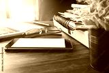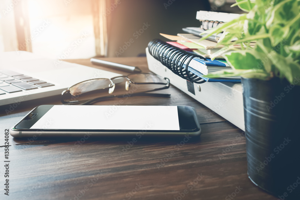 laptop with smartphone and office equipment on desk. vintage style, can be used for ad.