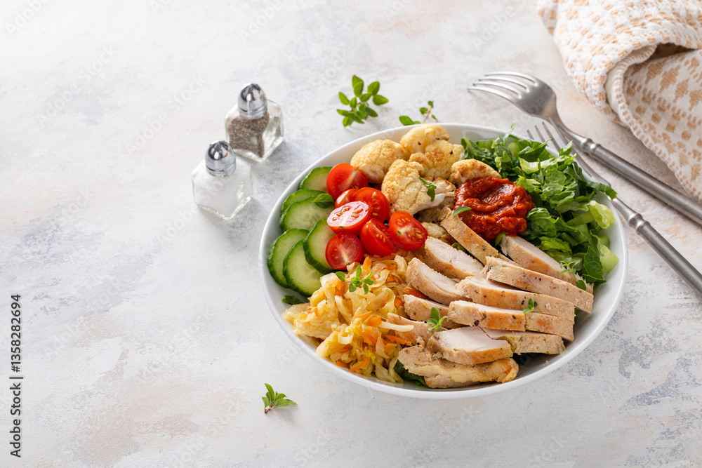 Healthy lunch bowl with grilled chicken, roasted cauliflower and fresh vegetables