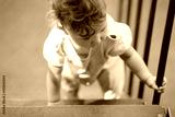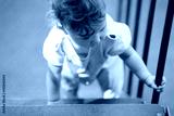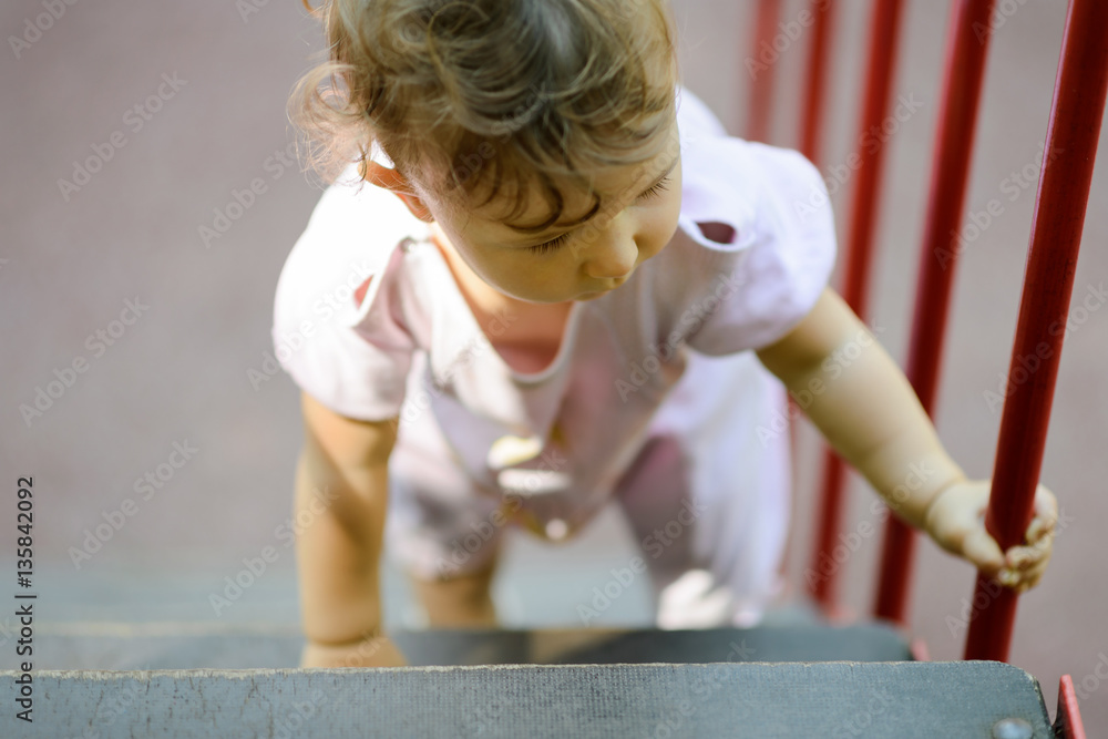 The one-year child climbs up the stairs. Cute baby girl plays on the playground.