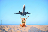 Happy satisfied smiling cheerful joyful traveler girl with open arms watching airplane flying overhead