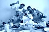 Happy Three Generation Muslim Family Selfie Using Smartphone At Dining Room Celebrating Eid Al Fitri