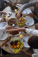 Top View Of Hands Taking Food During Eid Celebration Or Lebaran Moment.