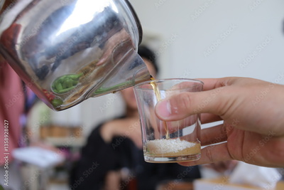 Close Up Of Pouring Tea With Hands Holding Glass