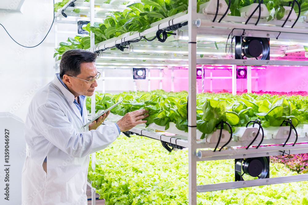 Scientist examining hydroponic lettuce in an indoor vertical farm with tablet. Eco-friendly farming technology, sustainable agriculture, and modern cultivation for efficient food production.