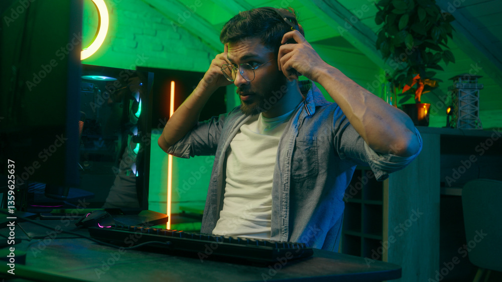 Happy Indian man put on headphone talking to microphone start online internet stream vlog blog gaming waving hello greeting computer male Arabian guy radio host work gamer streamer neon night home