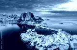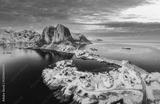 Landscape of aerial view of snowy mountain and fishing village on coastline in winter at Lofoten Islands