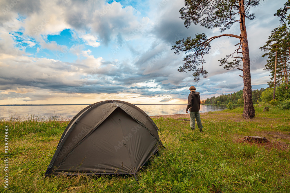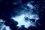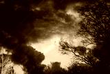 Dramatic Sunset Sky with Silhouetted Bare Trees. A moody and dramatic photograph of a sunset sky filled with deep purple and fiery orange clouds. The silhouettes of bare tree branches add contrast